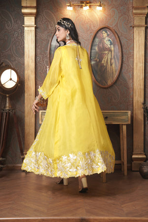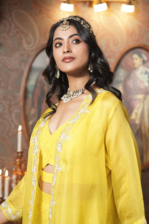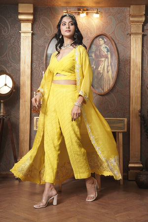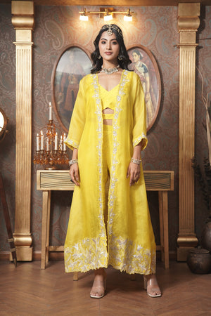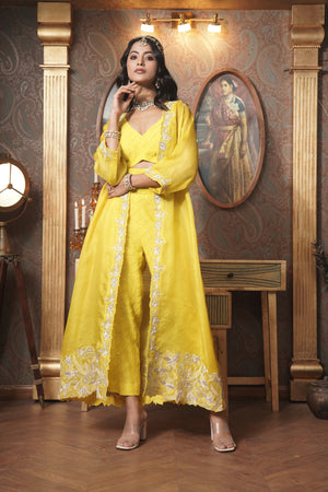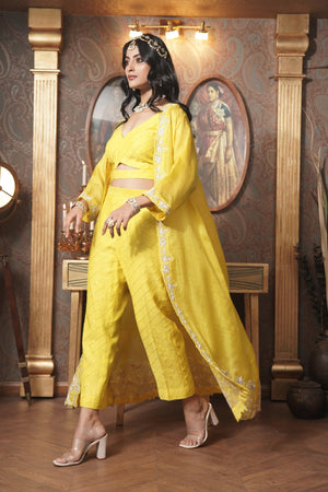 Fabric: Organza Jacket with Mul Chanderi Crop top and Pants