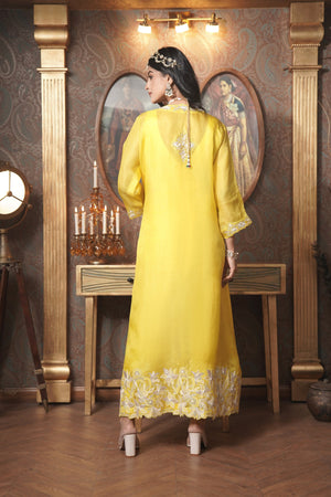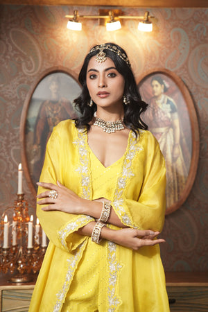 Enhance your style with this exquisite front-open organza jacket, adorned with intricate cutwork and delicate hand embellishments. Paired with a chic cut-out blouse and pants in shimmering sequin fabric, this ensemble seamlessly blends sophistication with a touch of glamour, perfect for making a bold fashion statement.