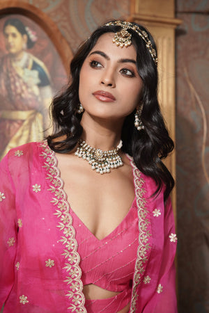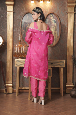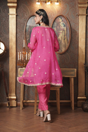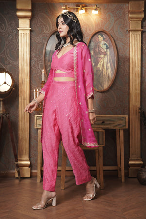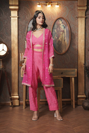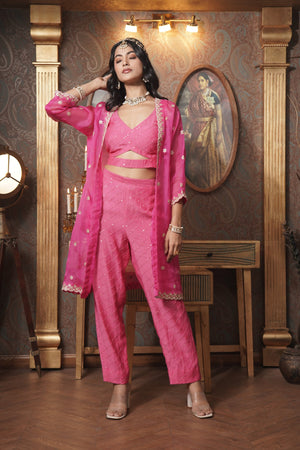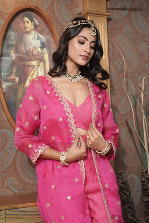Make a bold statement with this deep pink organza jacket, featuring intricate gota patti work that exudes elegance. This front-open jacket pairs beautifully with a chic cut-out blouse and shimmering sequin pants, creating a harmonious blend of traditional artistry and modern glamour. Perfect for any special occasion, this ensemble captures the essence of sophisticated style.