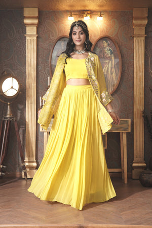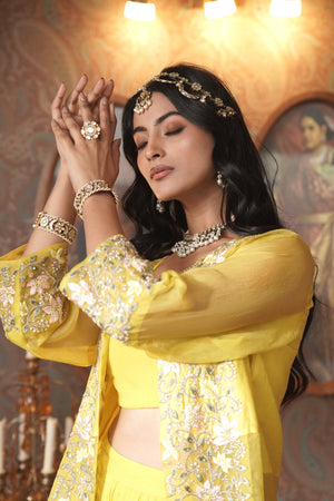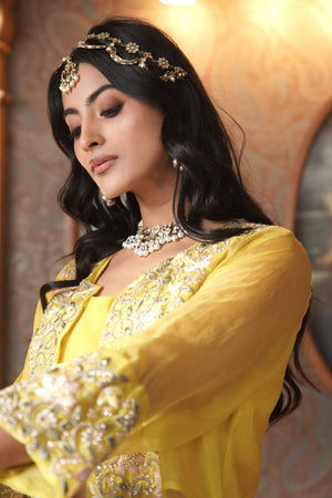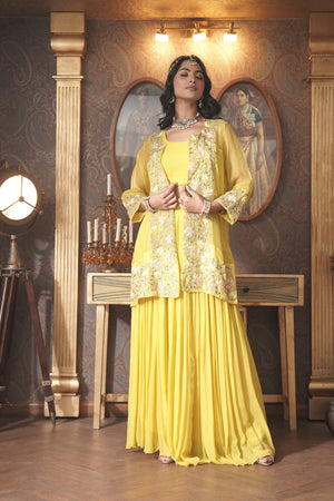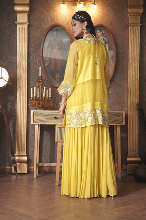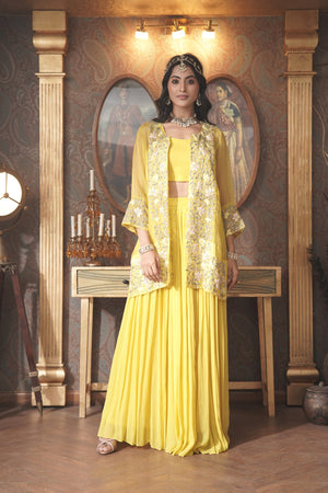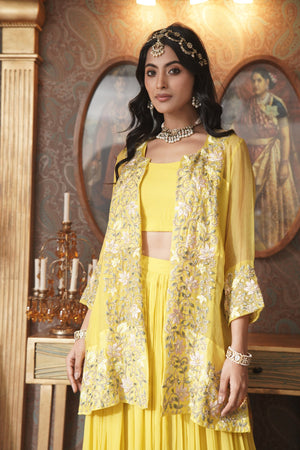 Step into style with this exquisite lime jacket, beautifully adorned with intricate thread embroidery and embellishments. This front-open, short jacket pairs perfectly with a matching blouse and flowing georgette sharara, all in the same vibrant lime hue. The ensemble effortlessly combines elegance and modern flair, making it a perfect choice for any festive occasion.