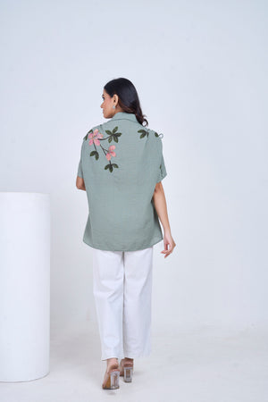 A breezy button-down in soft jade green, brought to life with hand-painted lilies and foliage. Shoulder gathers and tie-up tassels add a subtle playfulness to this relaxed silhouette — perfect for slow brunches and weekday errands alike.