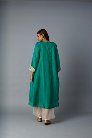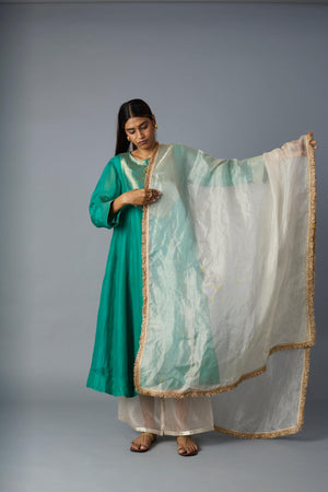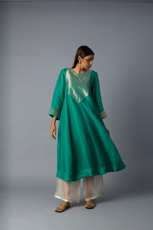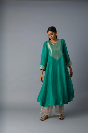 The Jahaan kurta set blends delicate green and ecru silk organza with a luxurious Banarasi zari twill yoke, creating a sophisticated fusion of textures. Its wide organza bottom adds graceful volume and movement, making it ideal for elegant occasions. Expertly crafted, this kurta set offers both comfort and timeless style. Pair it with a matching or contrast dupatta.
