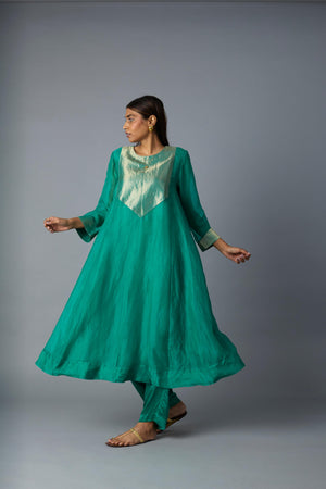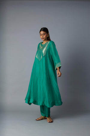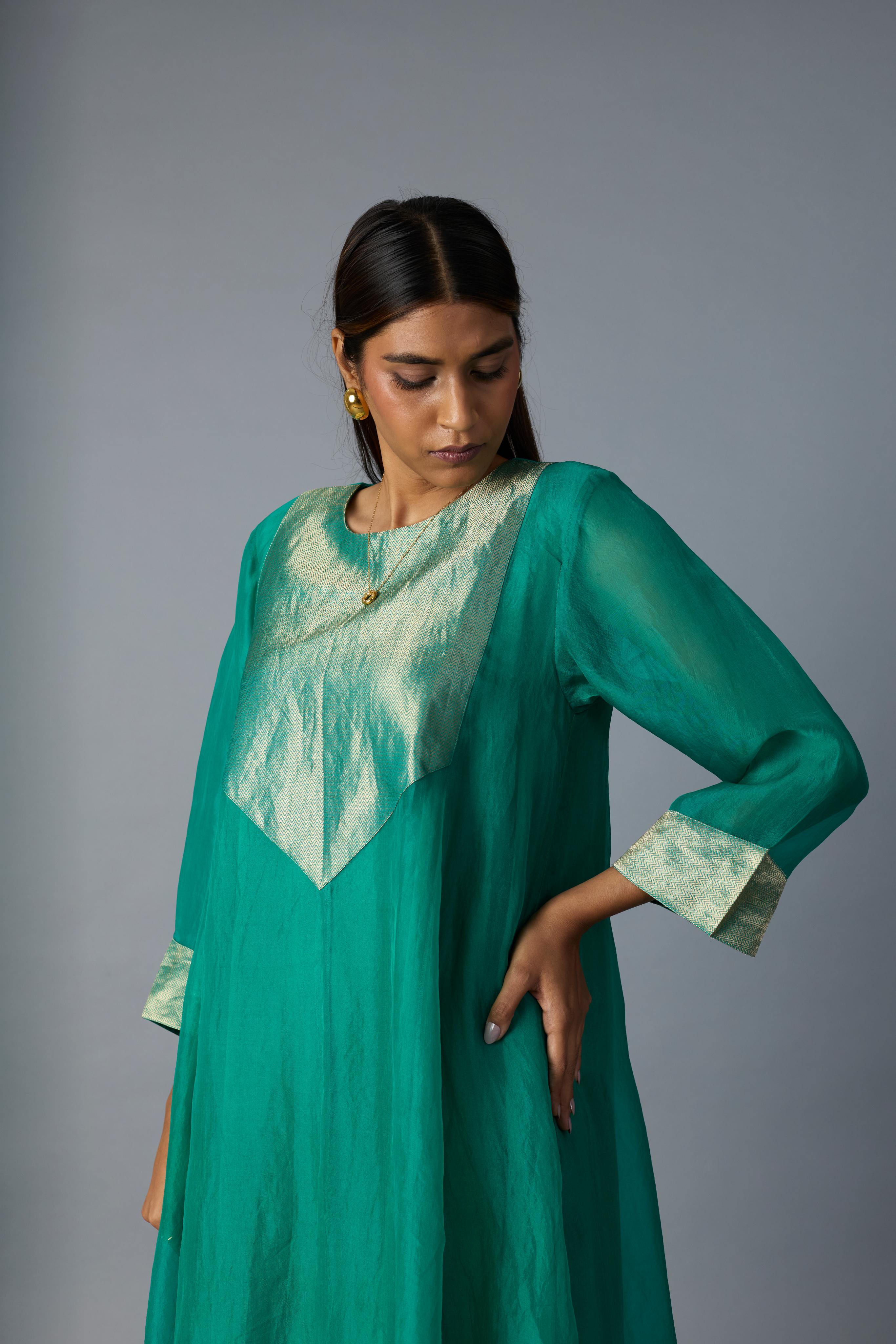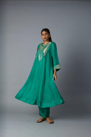 The Jahaan kurta set blends delicate tone on tone green silk organza and modal satin slim fit pants with a luxurious Banarasi zari twill yoke, creating a sophisticated fusion of textures. Its wide organza bottom adds graceful volume and movement, making it ideal for elegant occasions. Expertly crafted, this kurta set offers both comfort and timeless style. Pair it with a matching or contrast dupatta.