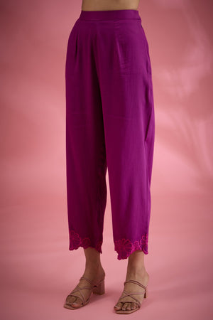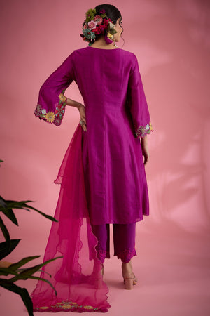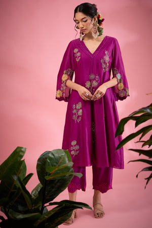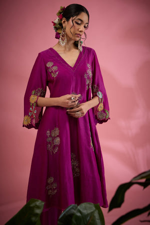 Introducing a V-neck kurta in shades of violet and magenta. This kurta features elegant flared sleeves and is adorned with embroidery patches throughout, enhancing its overall grace. The rich colors and intricate details make it a stunning choice for any occasion.