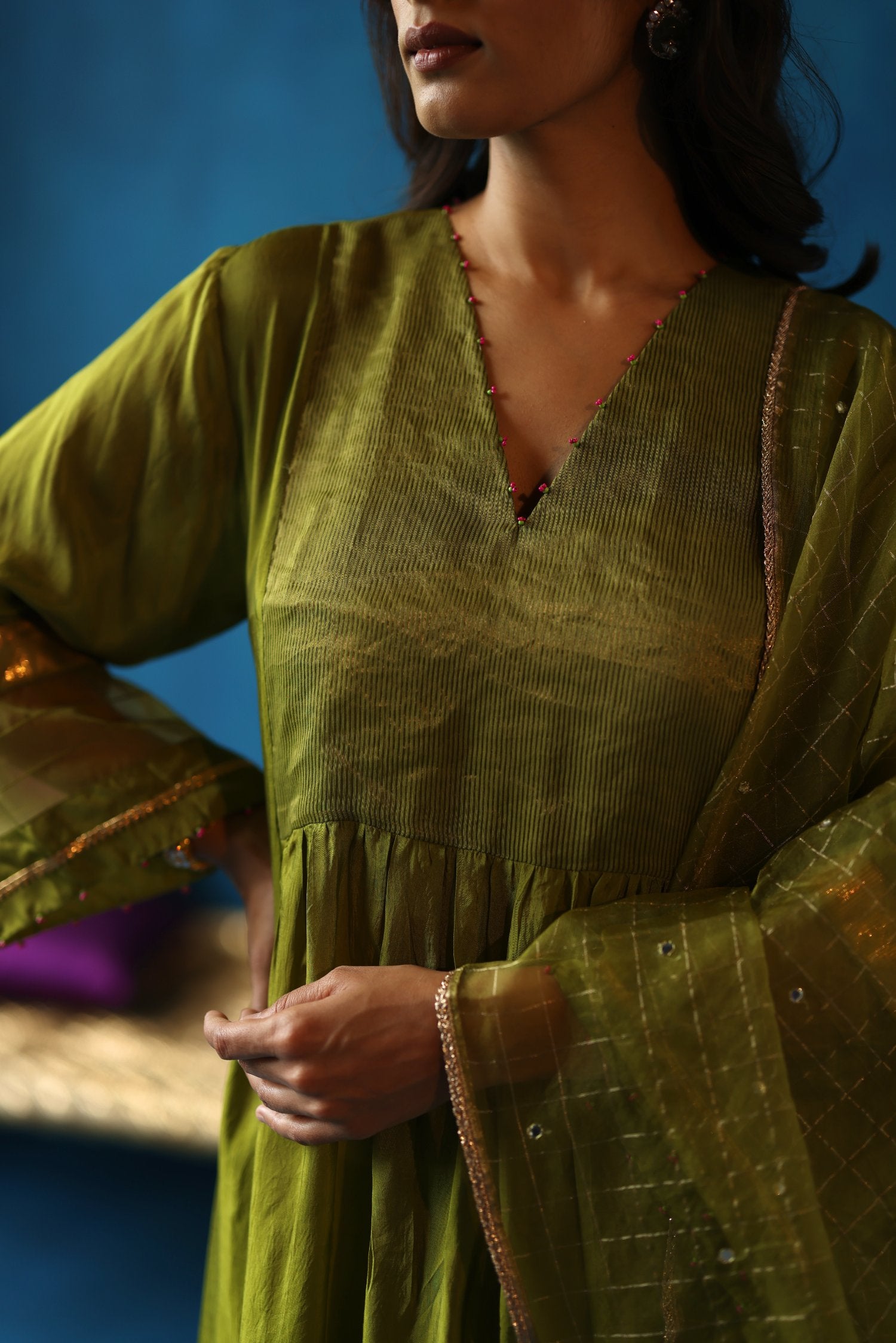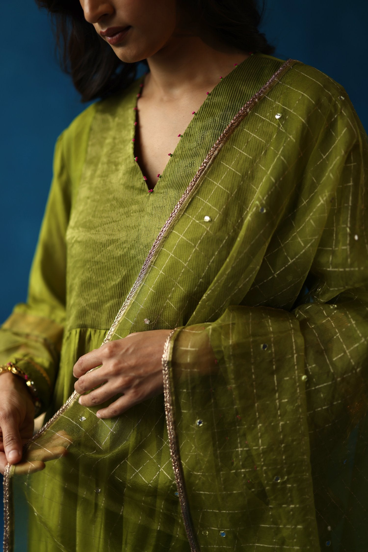 Jamun Kurta Set features contrasting color panels, zari silk yoke, delicate gatherings on the front, and dainty accents on the neck and sleeves. Habutai silk pants complement the Habutai kurta and a checkered organza stole.