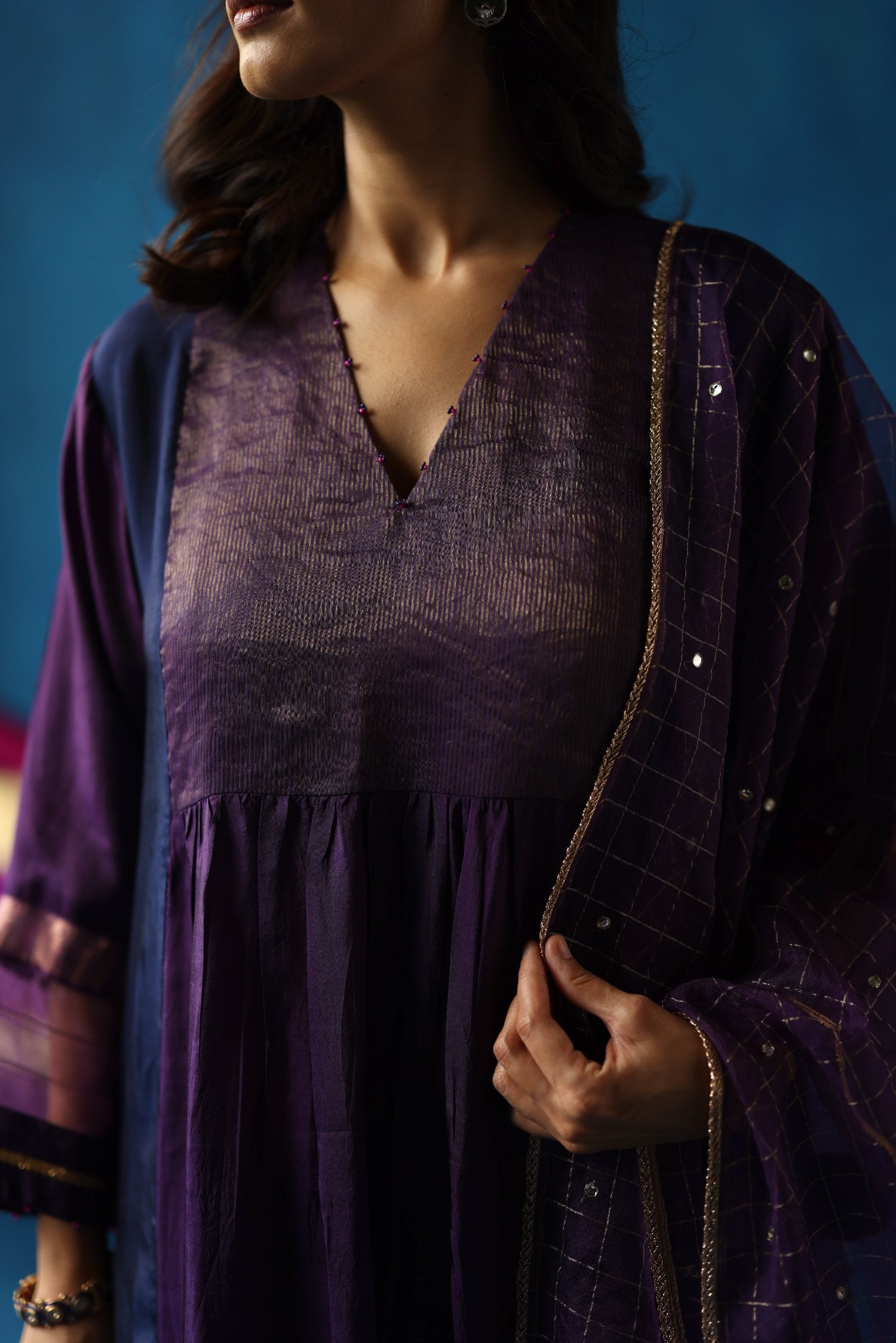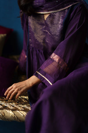 Jamun Kurta Set features contrasting color panels, zari silk yoke, delicate gatherings on the front, and dainty accents on the neck and sleeves. Habutai silk pants complement the Habutai kurta and a checkered organza stole.