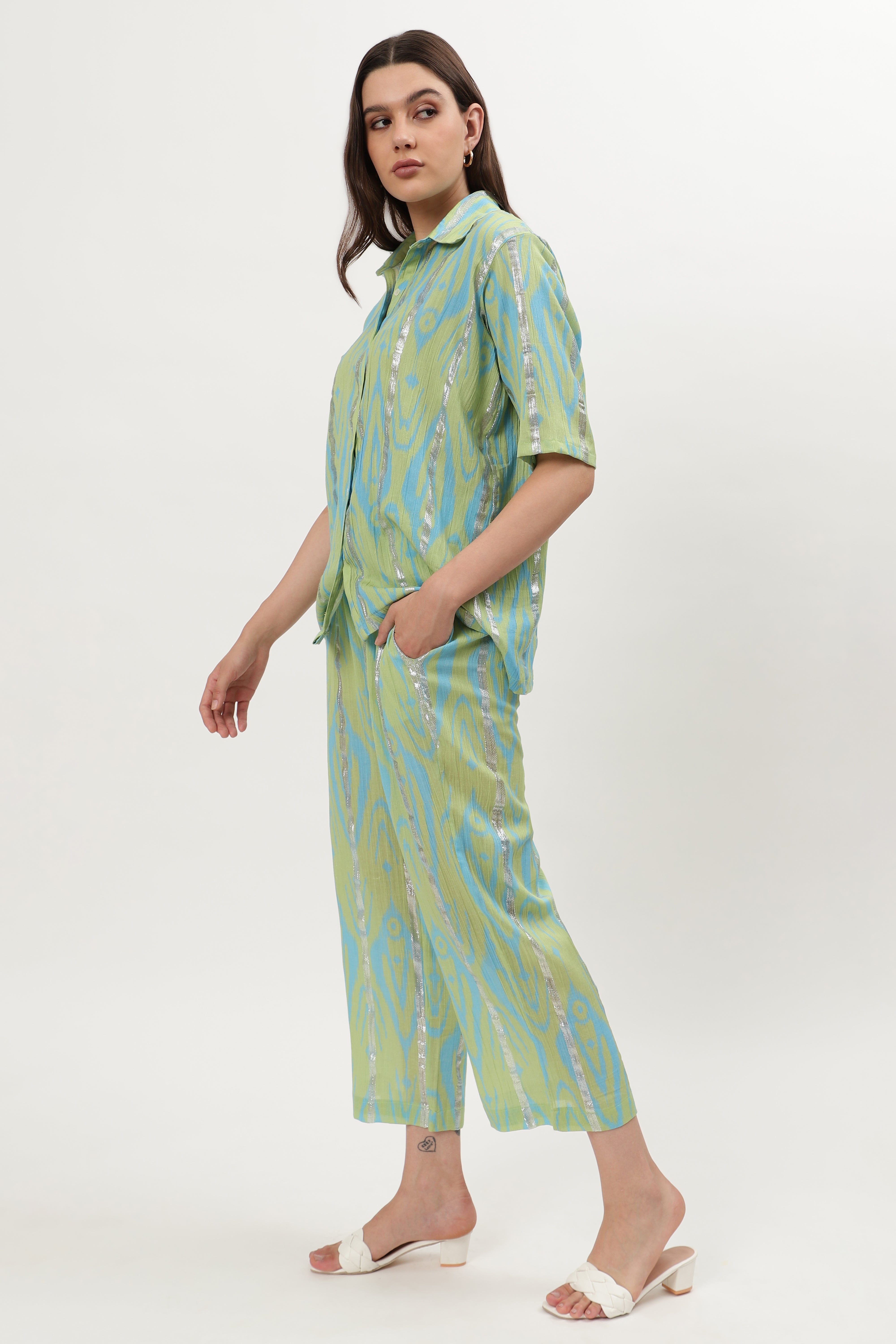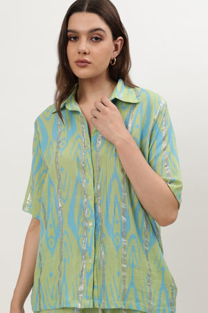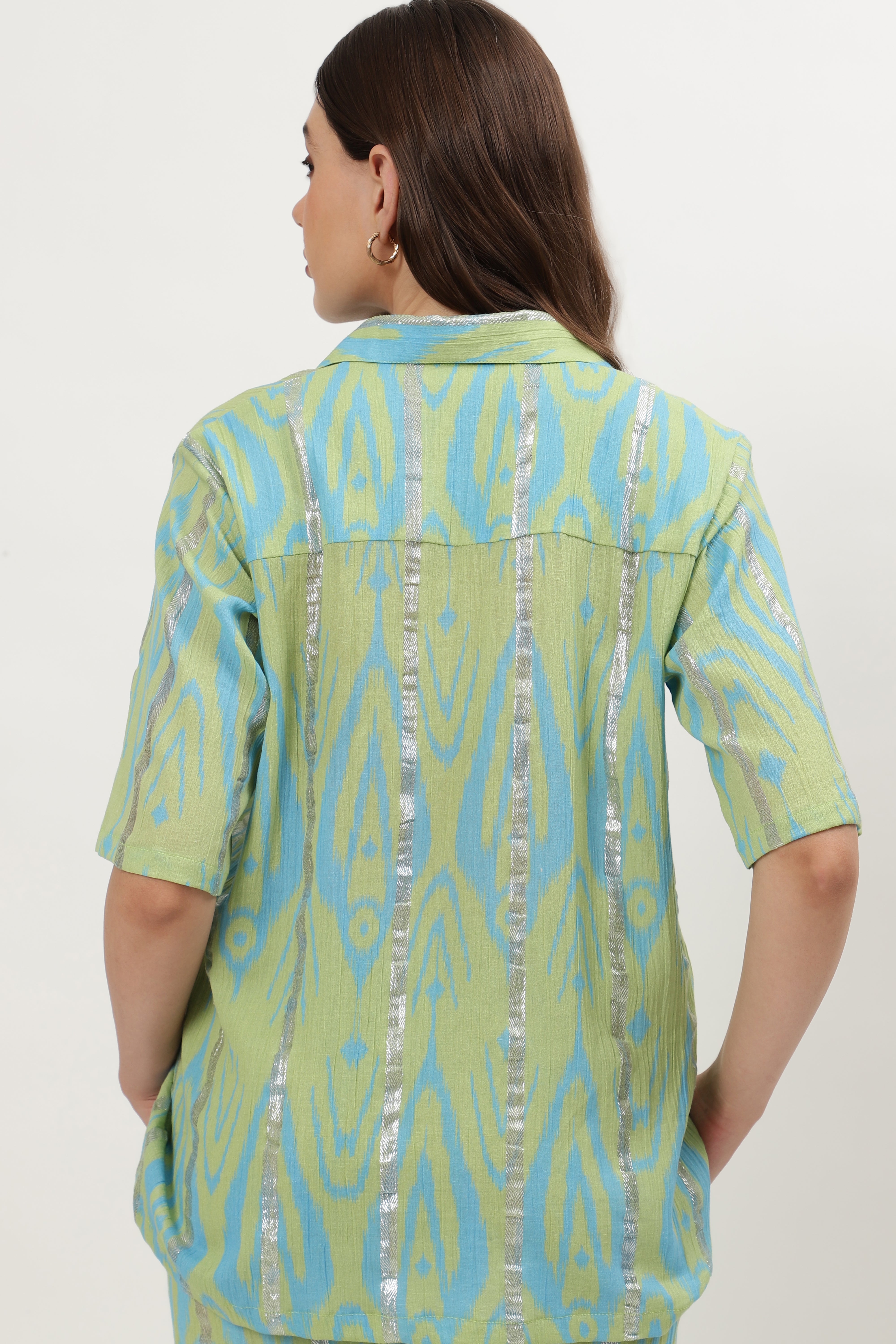 Janet collared half sleeves button down shirt in light green/light blue colour Ikat print cotton crepe