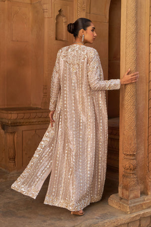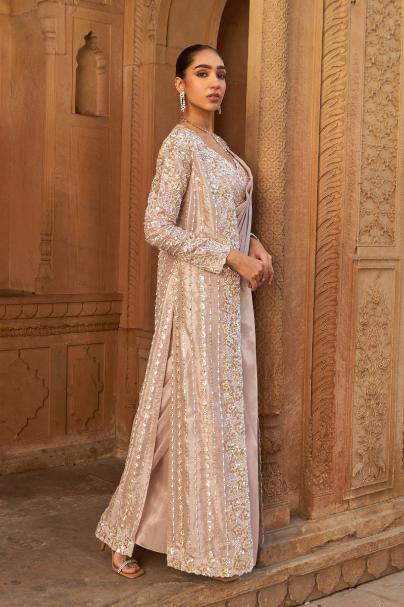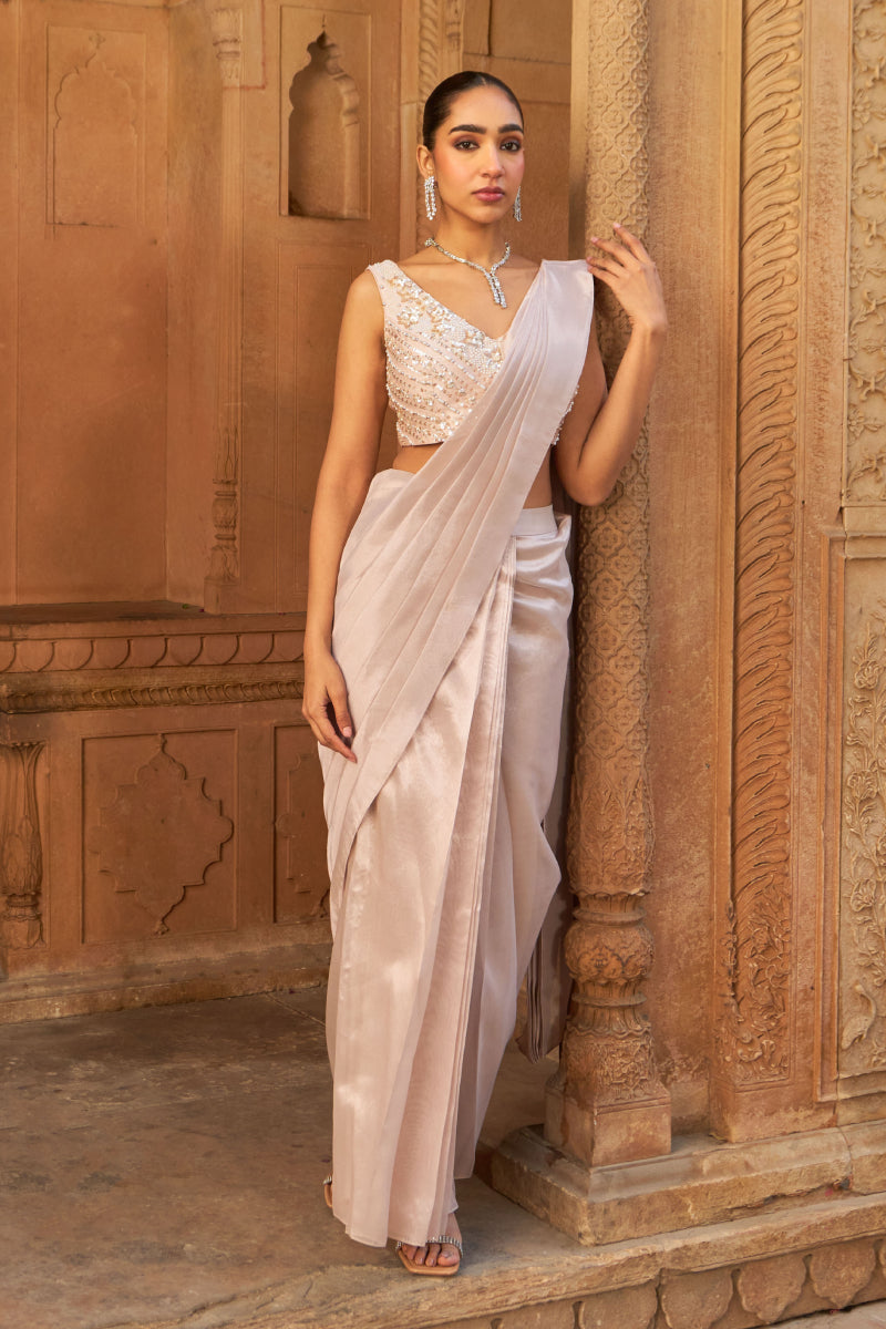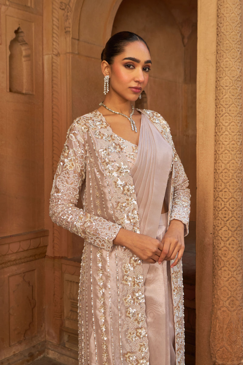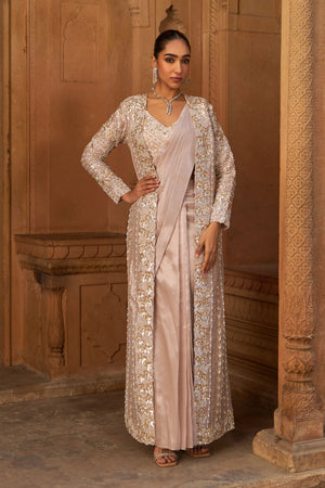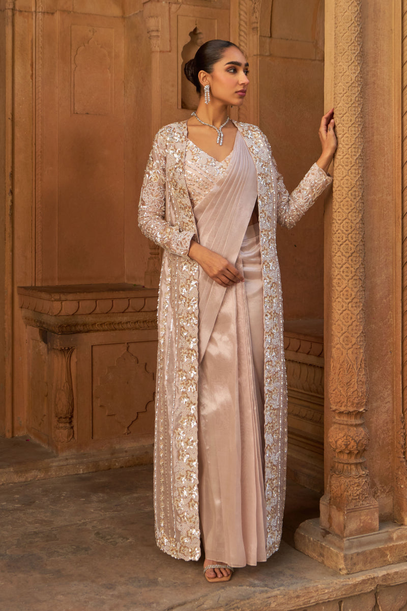This Alluring Outfit Is Made Up Of Tissue Fabric And Is In Blush Pink Colour .It Has Plain Saree And Blouse Is Without Sleeves, The Cape Is Also Embroidered In Geometric Form With Sleeves .It Completes With A Net Dupatta.