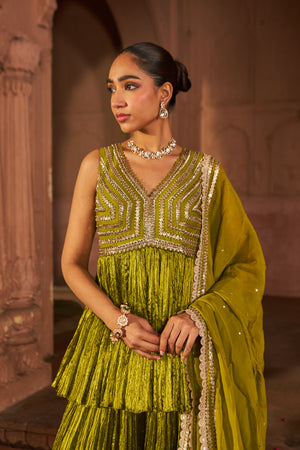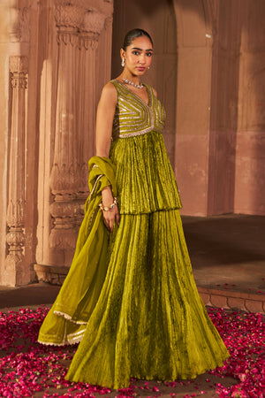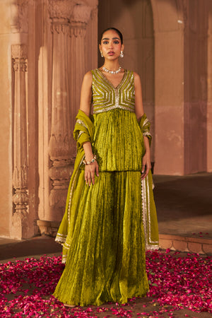 This Alluring Outfit In Crinkle Fabric Has Beautiful Tassels In Back .It Has Peplum Style Kurta With No Sleeves And Sharara Is In Plain Crinkle Fabric. The Outfit Is Padded.