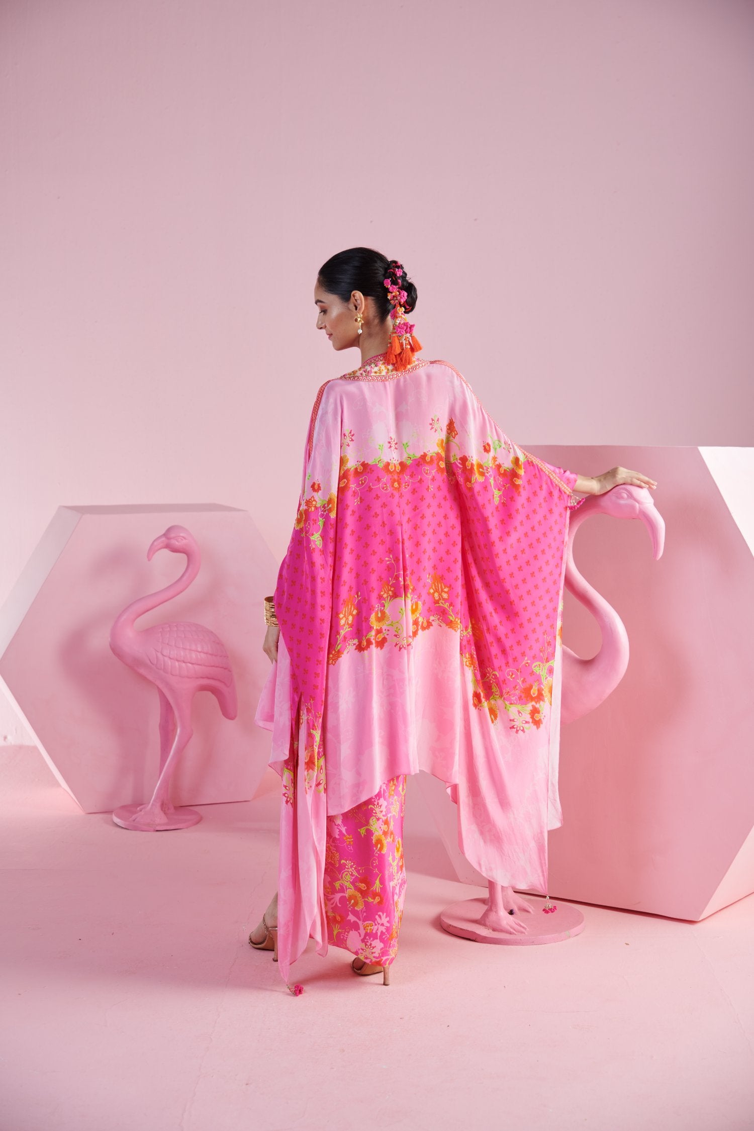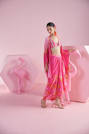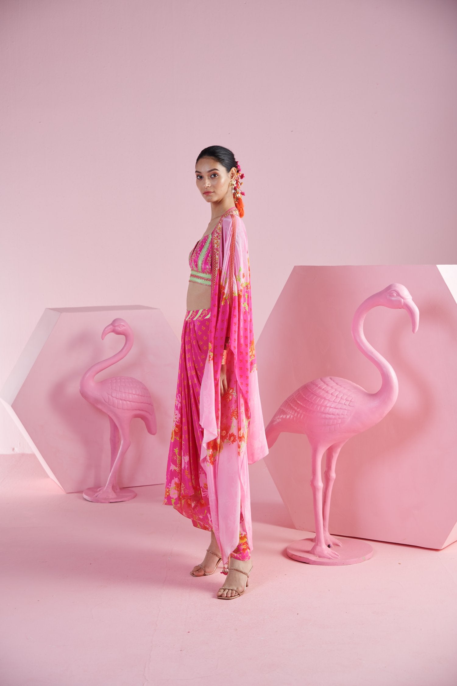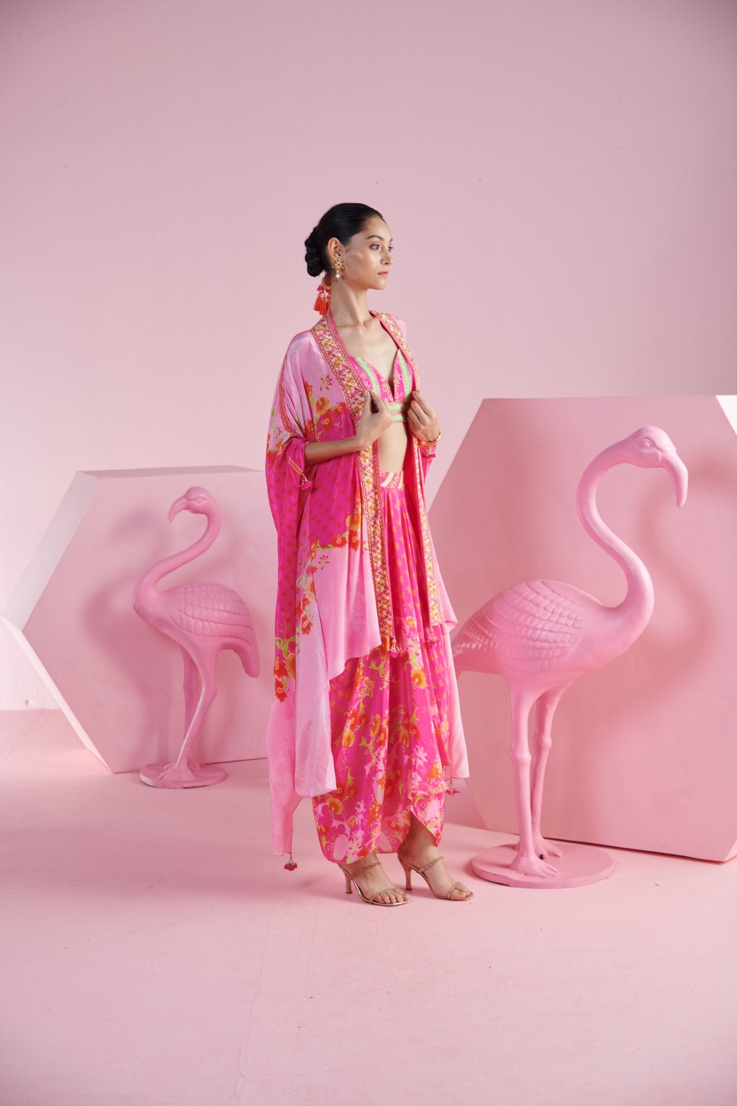 Discover the perfect blend of elegance and playfulness with the Blossom Cluster 3-Piece Set. This stunning ensemble features a vibrant pink and green printed blouse that adds a touch of floral charm to your look. Paired with a gracefully draped skirt, the set creates a flowing silhouette that moves beautifully.The shrug and the blouse has very beautiful embroidery detail which brings all life to the set. The printed shrug completes the outfit, offering an extra layer of sophistication with its complementary patterns. Ideal for any special occasion or a chic day out, this set combines stylish prints and versatile pieces for a standout wardrobe addition.