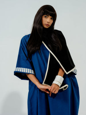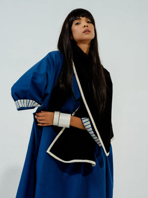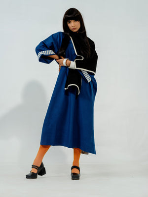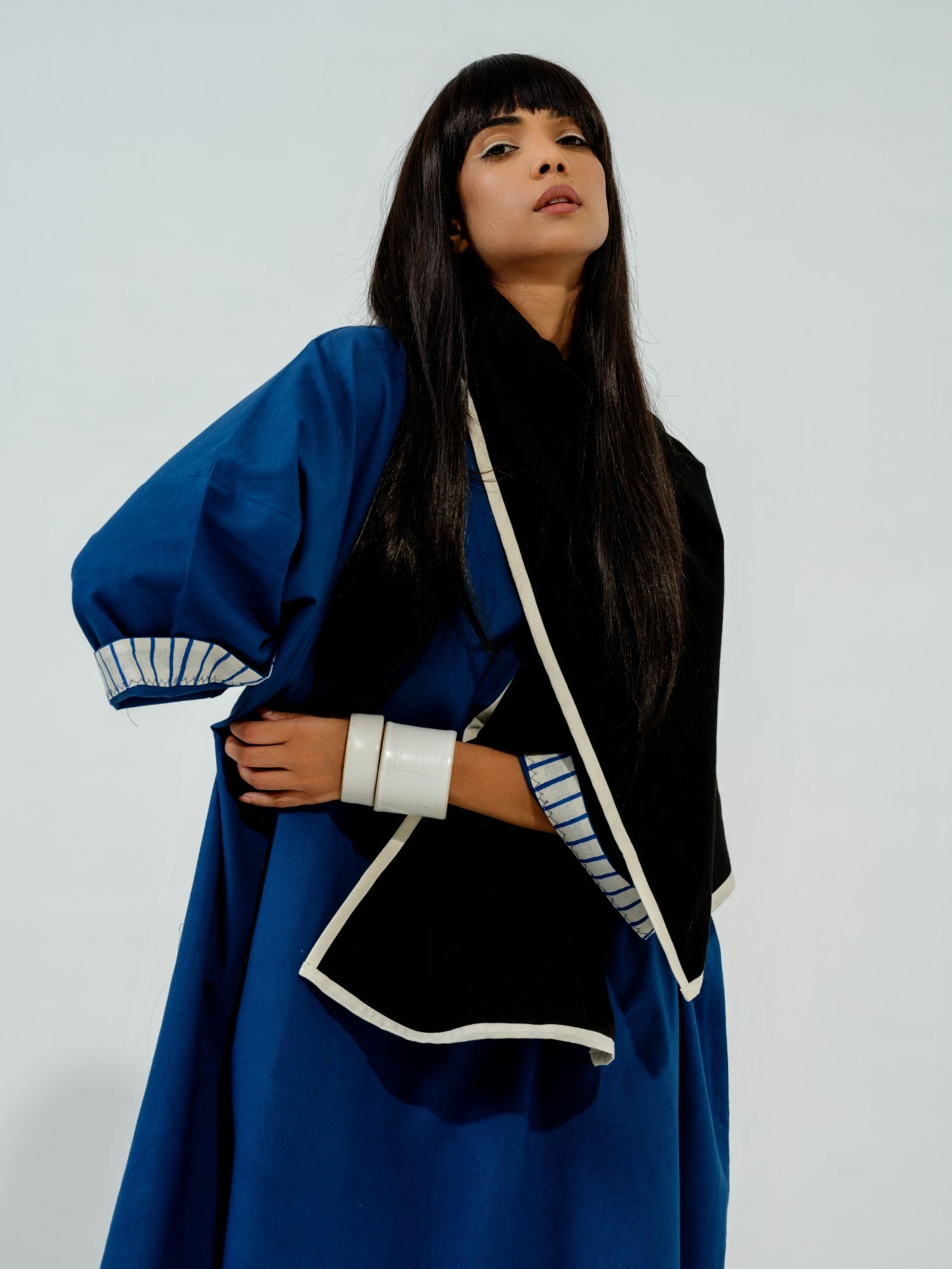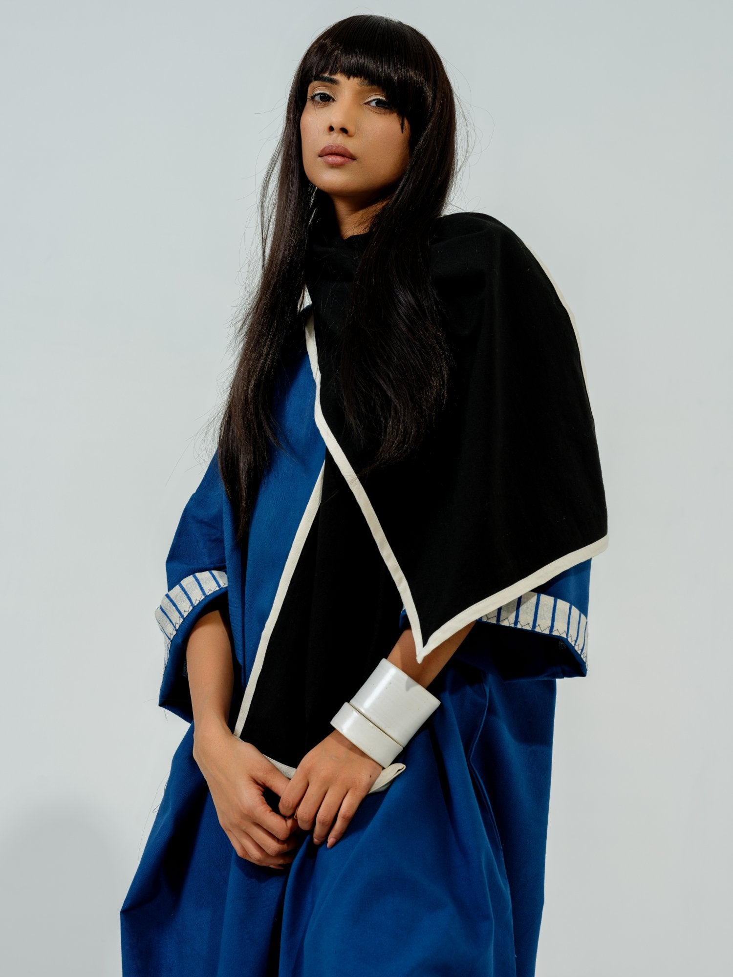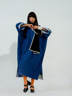 Free size dress with contrasting facings and a scarf attached on the neck with contrasting bindings