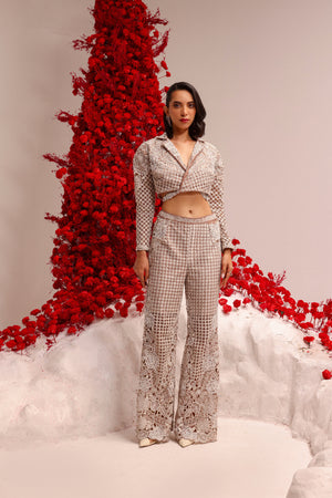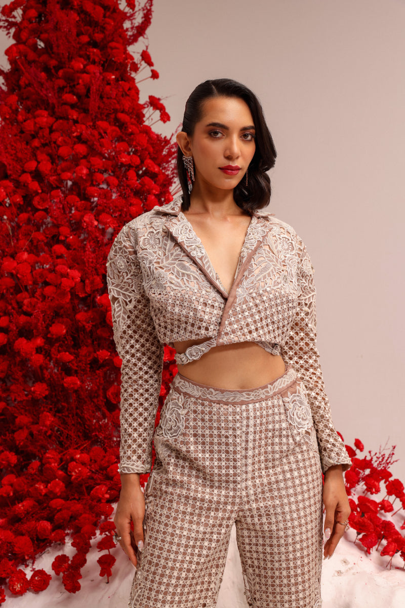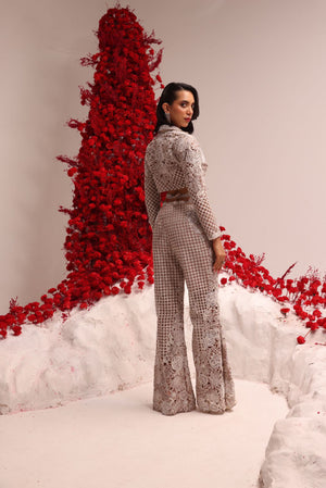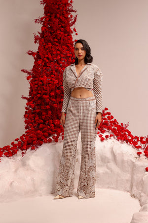 Mix of geometric and floral resham cutwork with intricate beads and katdana embroidery . Paired with a short jacket