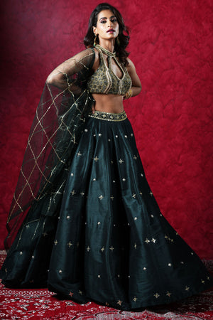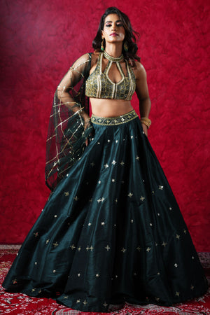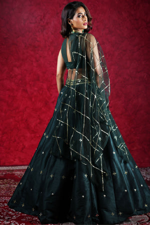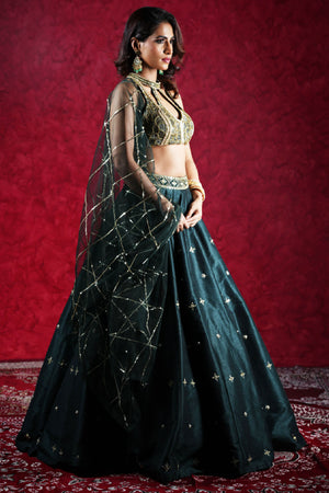 Dark Green Hand embroidered kalidaar lehenga with hand embroidered blouse and net dupatta.