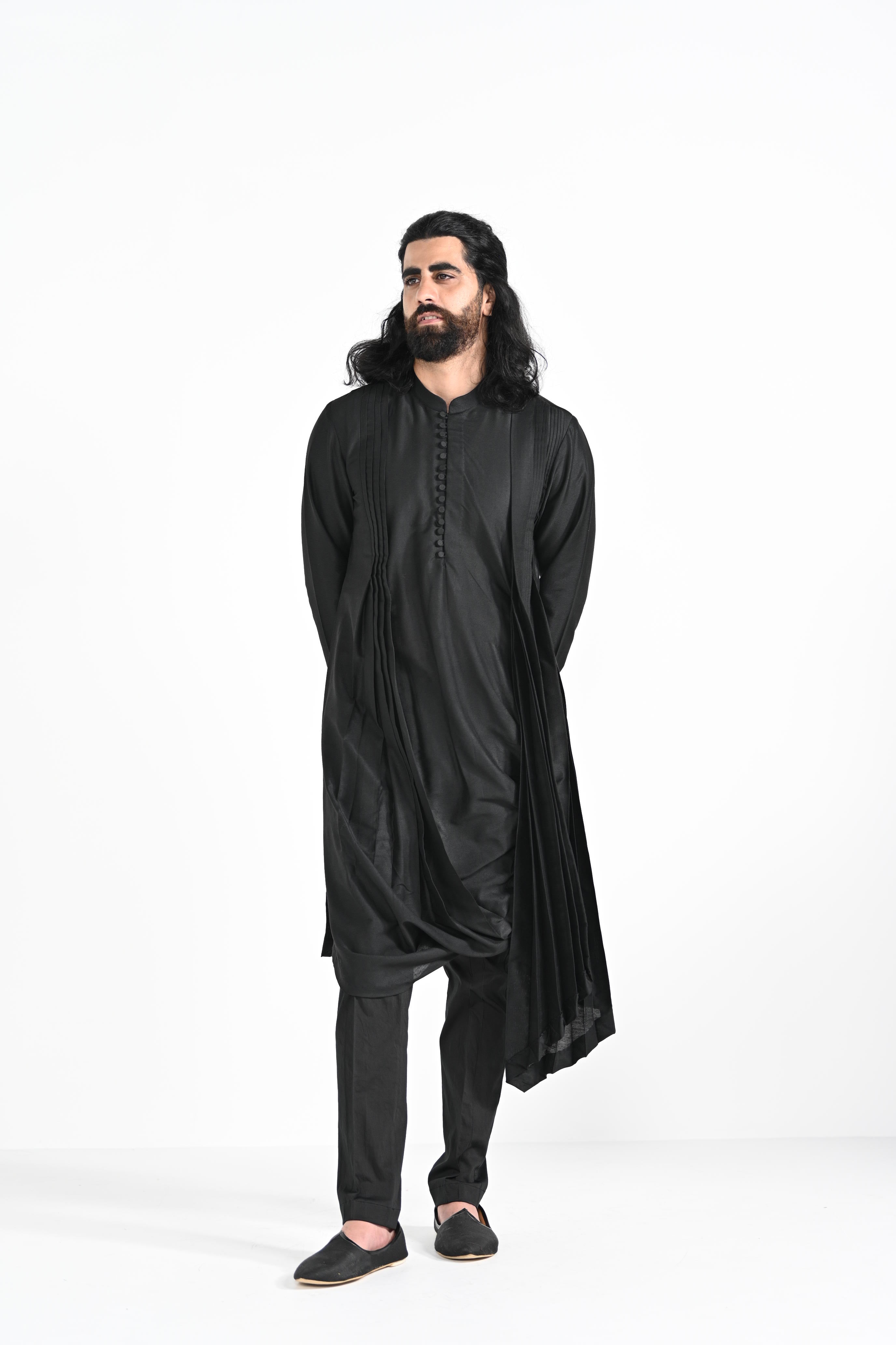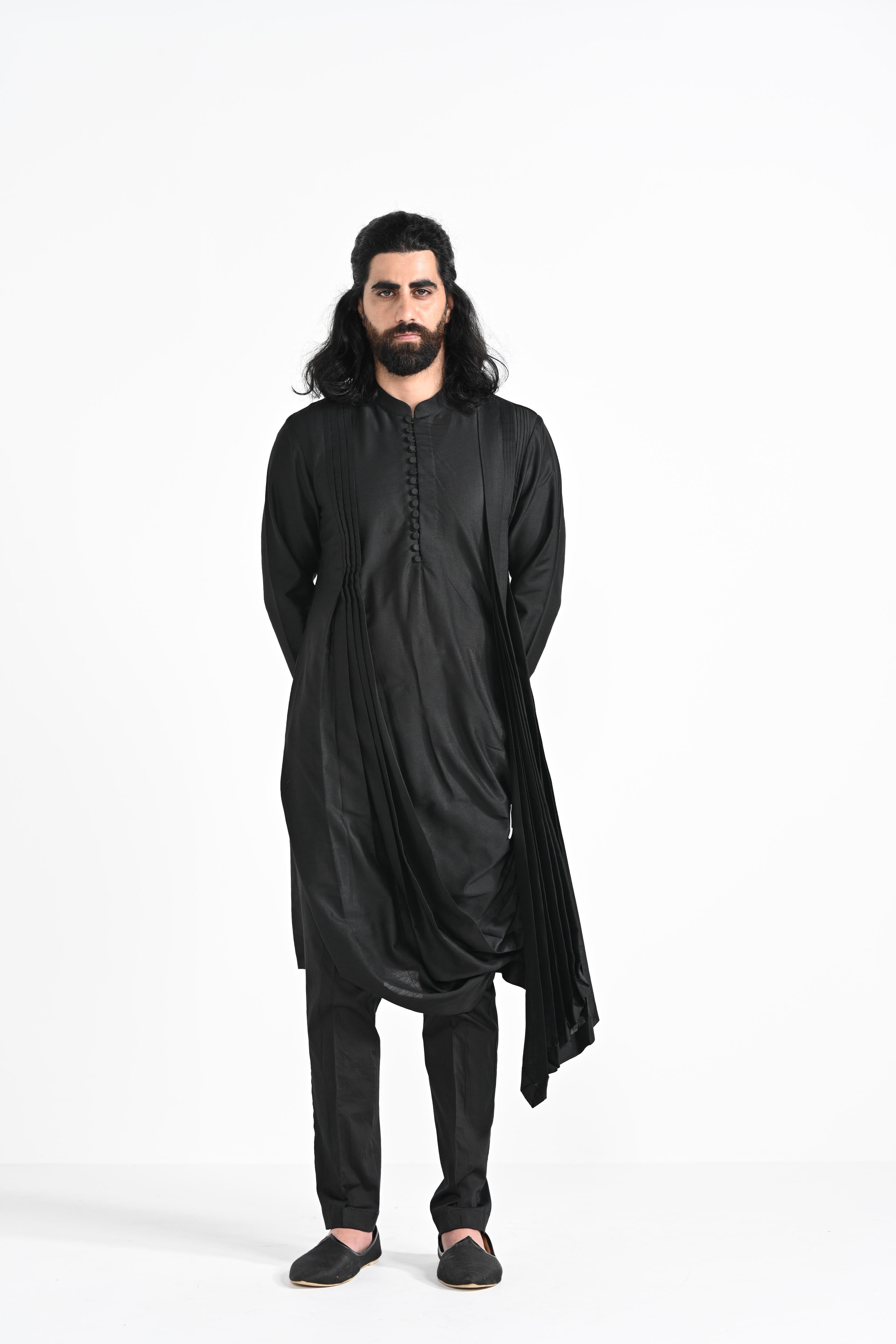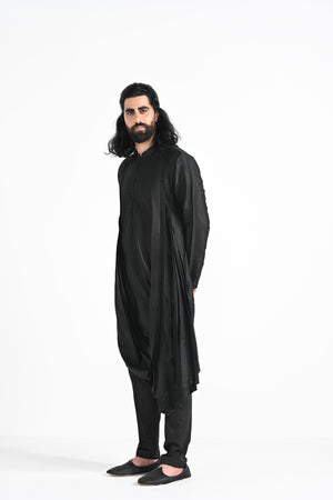 Jet black cowl drape kurta on bamberg raw silk.Paired with Buttercream slim fit Pant Pajama. Color of the actual garment may vary due to lighting conditions during the shoot.