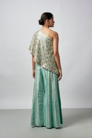 This contemporary pant set features a one-shoulder top with exquisite katri mirror work and intricate embroidery. The flared trousers are adorned with vertical mirror detailing making the ensemble perfect for modern occassions as well.
