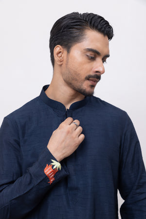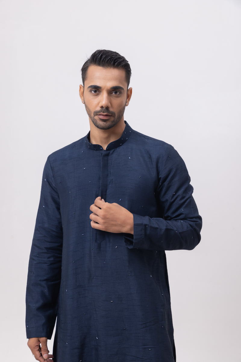 Our Jungle Kurta, rendered in deep twilight blue, whispers of hidden depths and untamed spirit. The subtle texture of the fabric hints at adventures untold, while the mandarin collar grounds you in sophisticated style. But look closer and find the subtle animals soaring on your wrist.