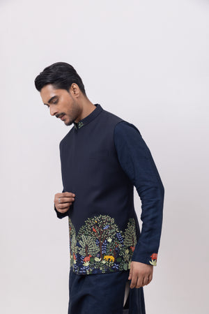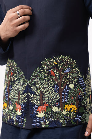 This navy Nehru jacket features detailed forest embroidery at the hem, lush trees, vibrant animals, and pops of color bringing mythic charm and bold elegance to festive wear.