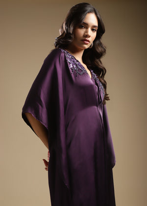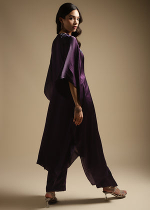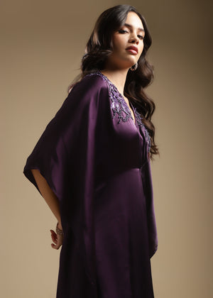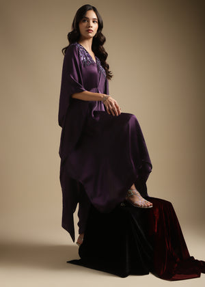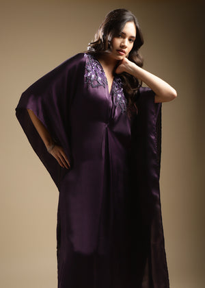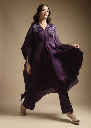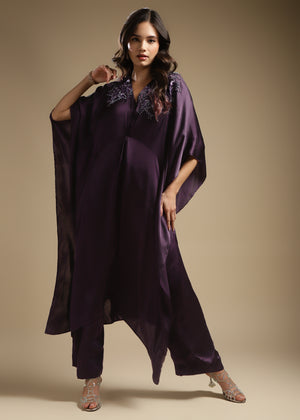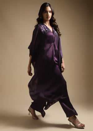 V-Neck Kaftan With Embroidery Detailing On The Front And A Fine Pleating Detail. Paired With Straight Pants.