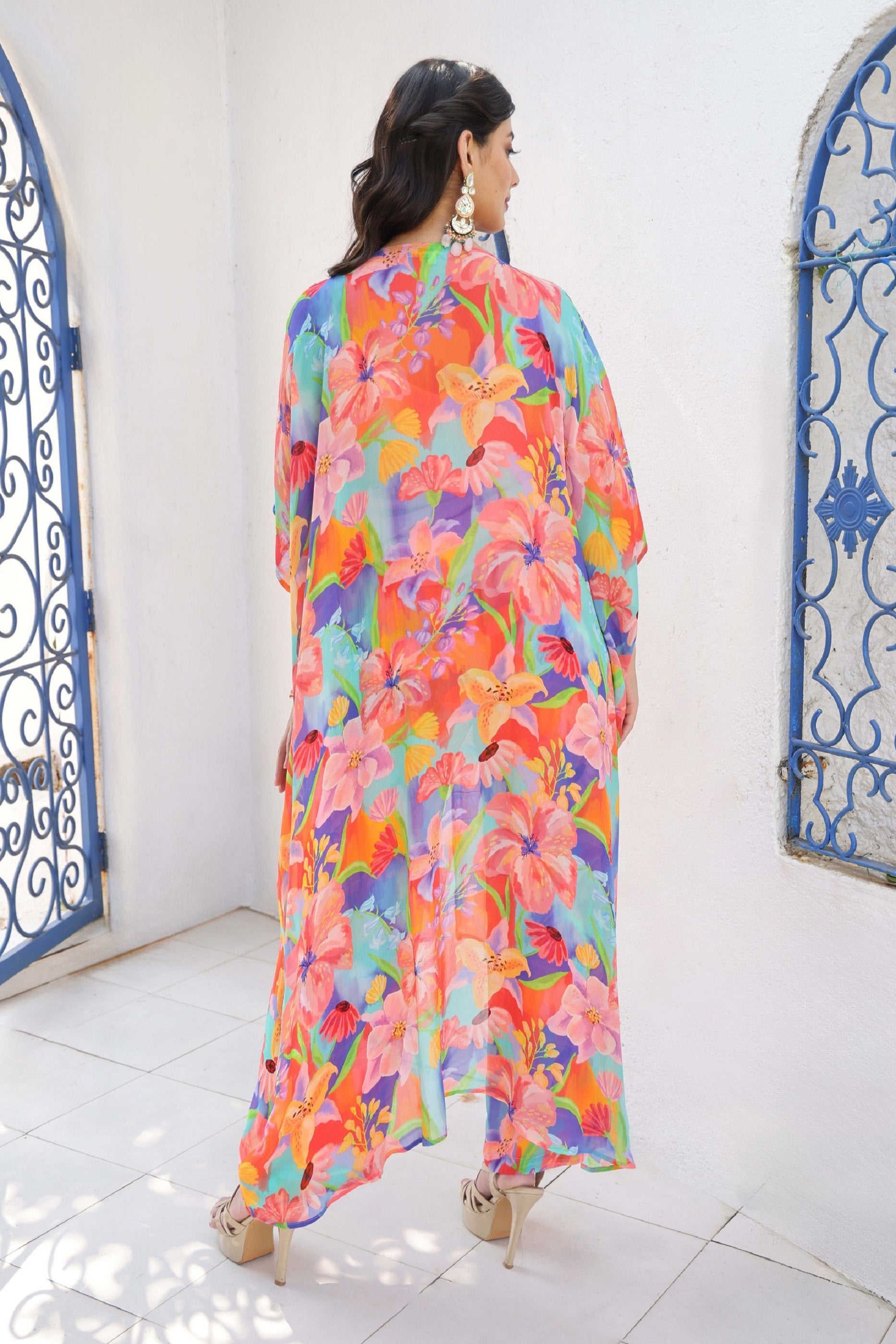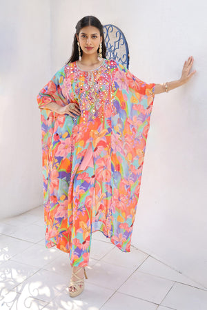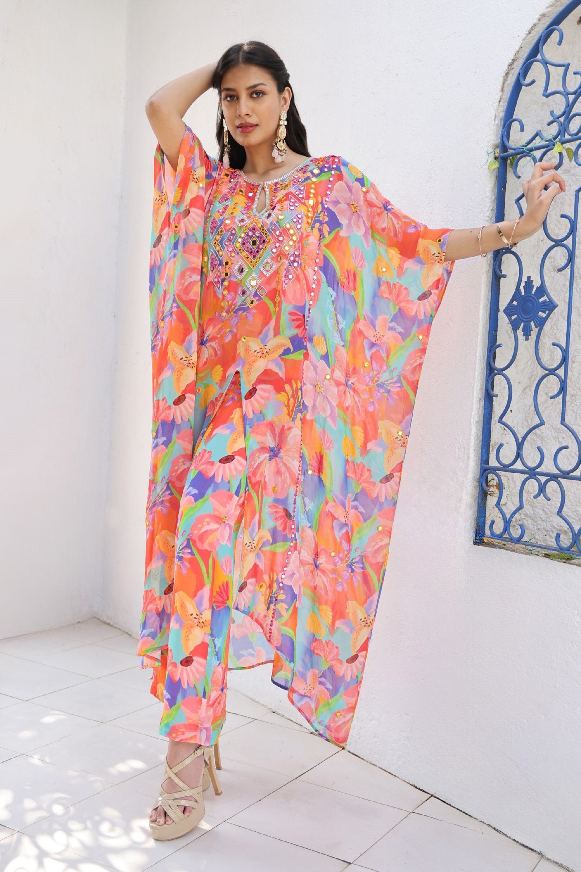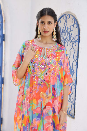 This Chic Printed Kaftan Set Is Made From Premium Georgette Fabric. The Kaftaan Is Intricately Hand Embroidered With Mirror Scattered All Over The Body, Stylishly Paired With Matching Printed Pants.