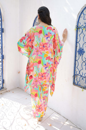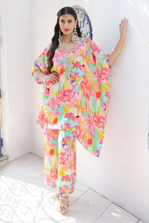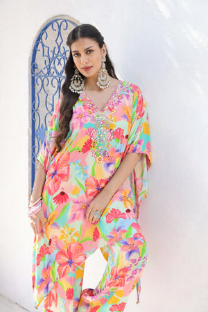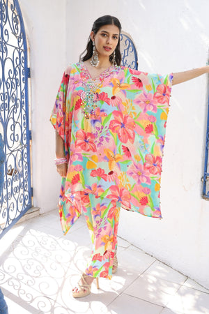 Kaftan Set Crafted From Vibrant Printed Georgette Fabric. The Kaftan Features Detailed Hand Embroidery, Adorned With Delicately Scattered Mirrors, Paired With Matching Printed Straight Pants.