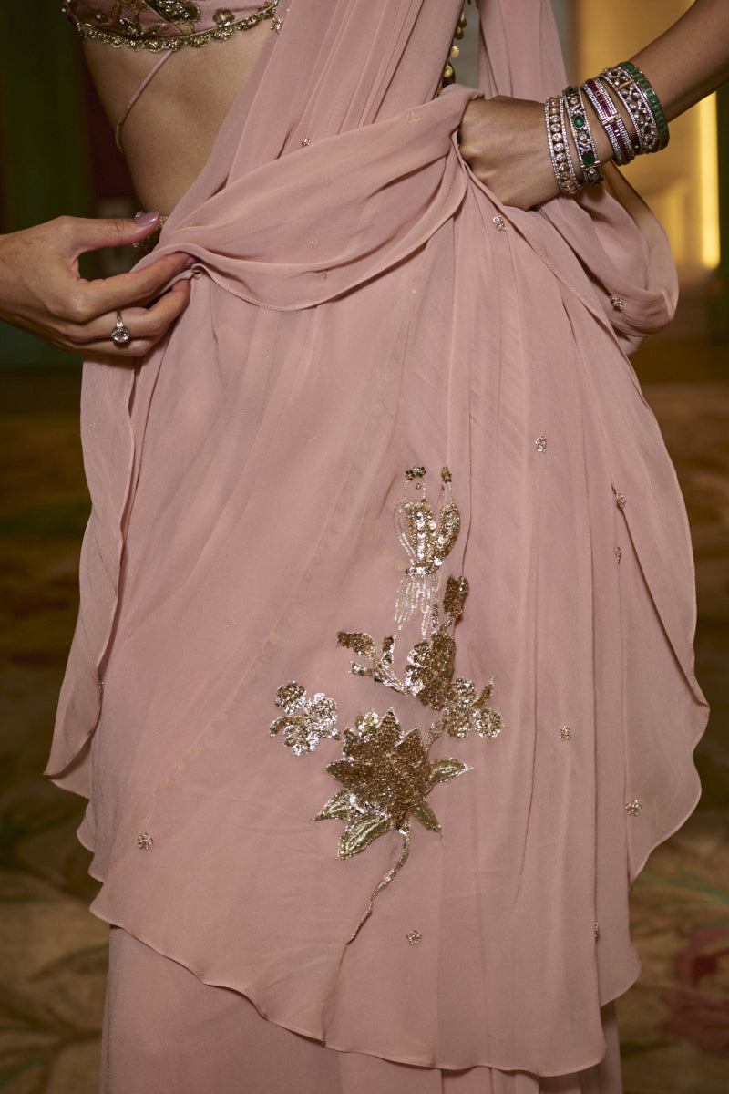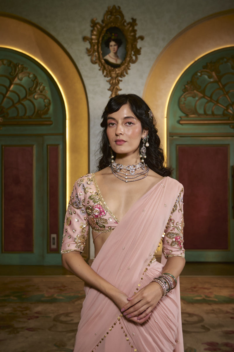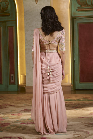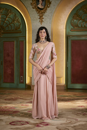 Our light pink pre-draped chiffon saree, finished with delicate detailing, is paired with a floral printed blouse featuring a charming tie-up detail at the waist. This ensemble blends soft femininity with contemporary elegance.