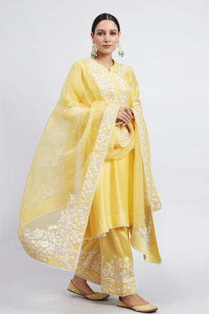 The Kaina ensemble from our Gulnaar collection is made using a pure Chanderi Silk fabric and is adorned with exclusive Parsi-Gara Embroidery. It features a Mandarin collar with a placket and three-quarter sleeves. The look comes with a Dogri Salwar and an Odhni. The outfit is finished using an exquisite Pearl lace.