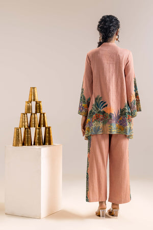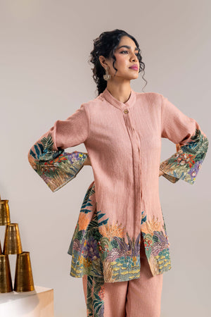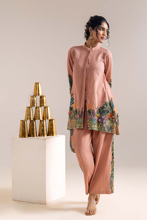 Pink Kaira Embroidered shirt-style kurta paired with printed pants in khadi cotton