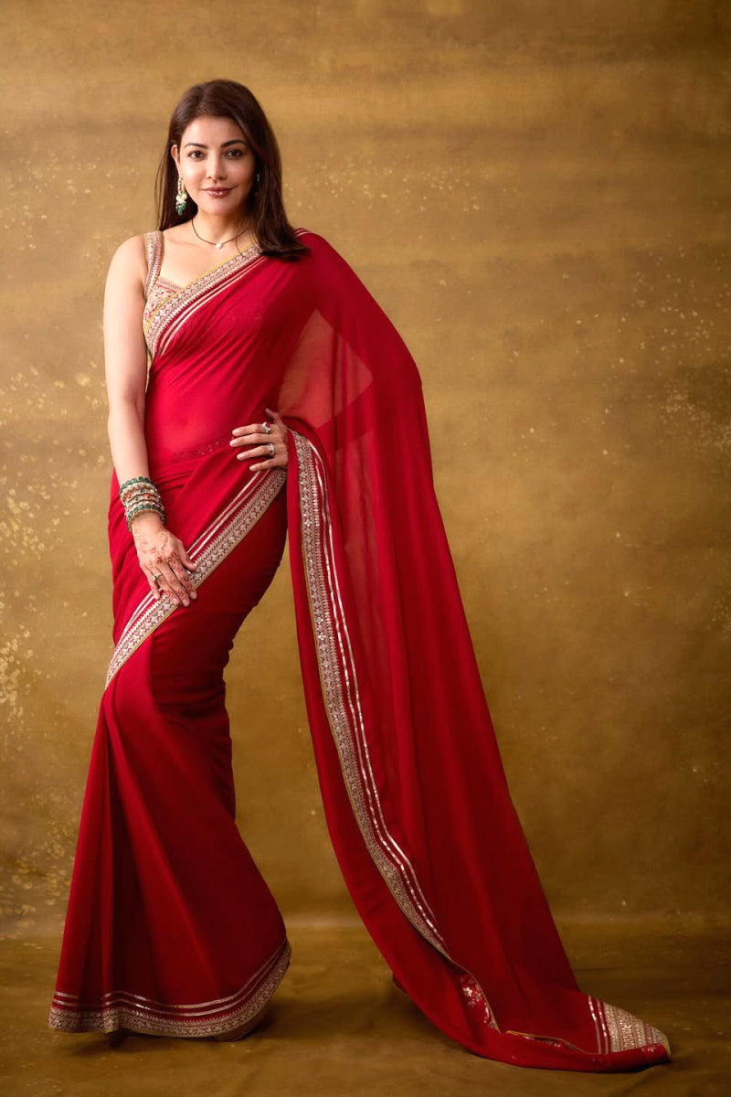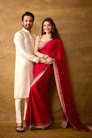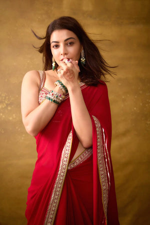 This classic red saree radiates effortless elegance and timeless appeal. Crafted from a lightweight, flowy fabric, it features a rich hue that beautifully complements its subtle accentuating the silhouette with refined sophistication. Paired with a sleeveless blouse that mirrors the border’s embroidery, the look strikes the perfect balance between minimalism and festive charm.