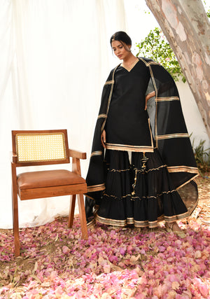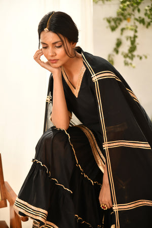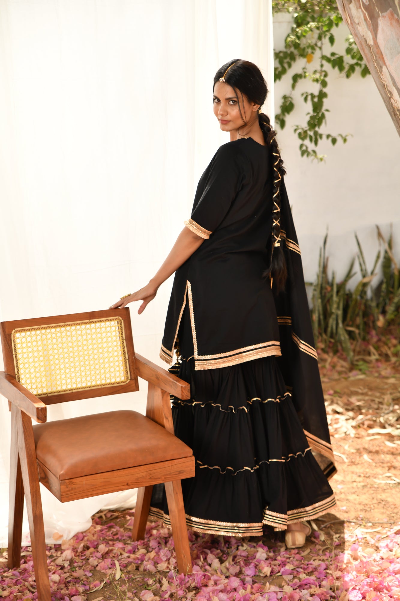 Cruise through the world of fashion by wearing this V neck kohl black short garara kurta finished with Zari laces on the neck, sleeves and hemline. It is paired with a tiered sharara and comes with a kohl black dupatta with beautiful laces and Tassel adornments. Featuring elbow sleeves it is sure to impress everyone.