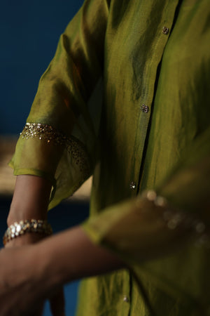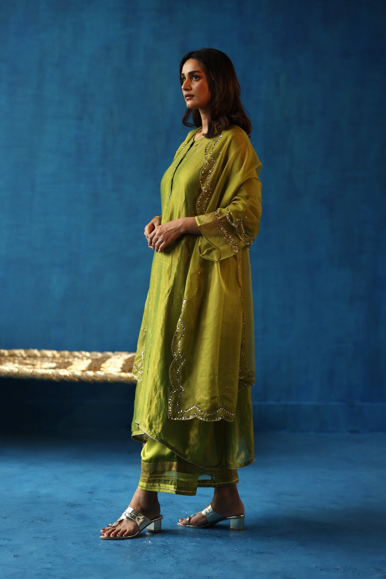 Zari silk kurta with an open panel design. The kurta is adorned with hand-embroidered sequin work on the sleeves and intricate dabka and zari work on the buttons, complemented with silk pants and an organza dupatta.