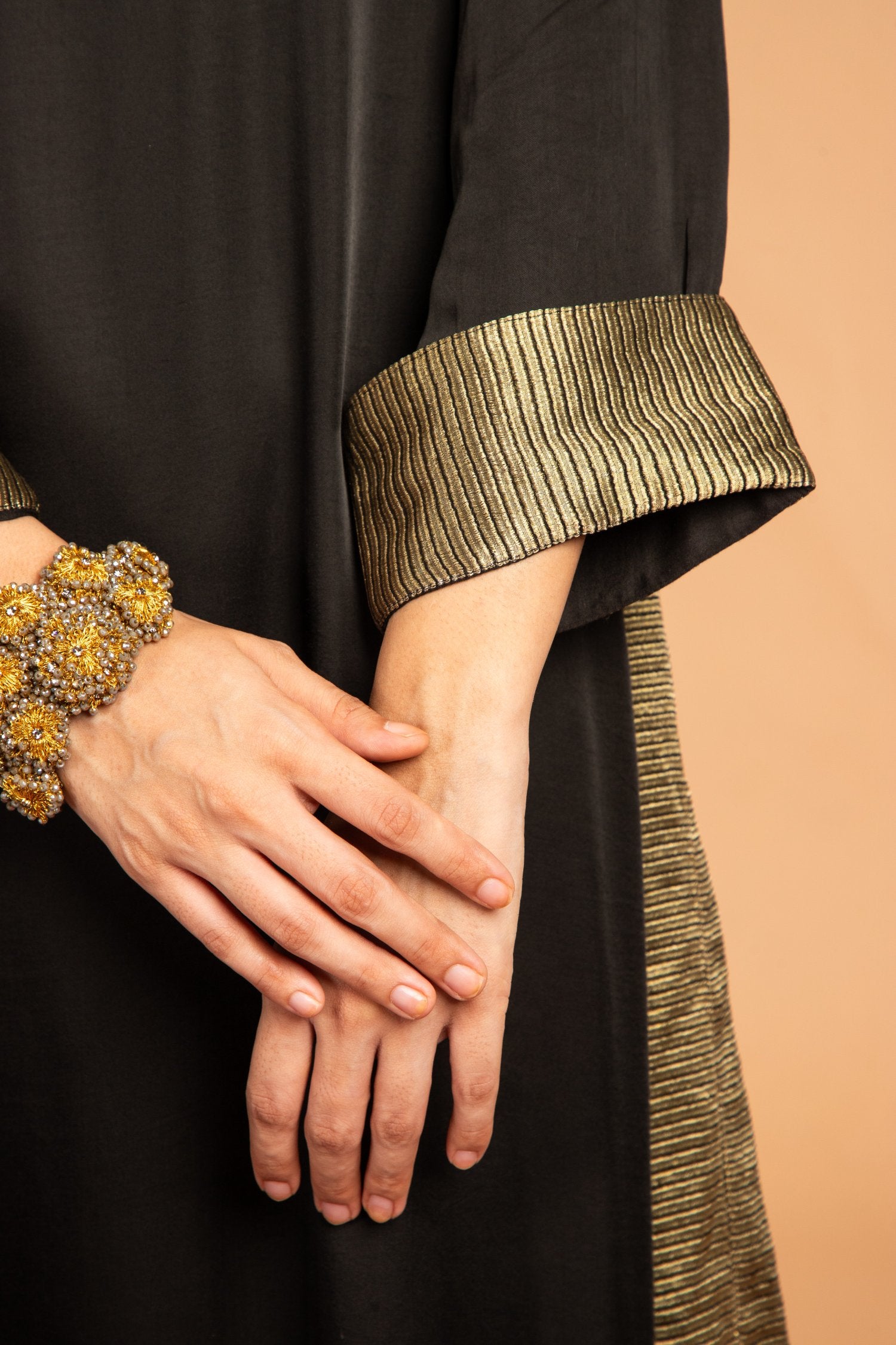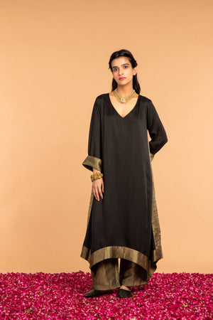 Classic dress with v-neck detail and asymmetrical cut at the bottom finished perfectly with zari stripes. It has zari stripes details on sleeves also.