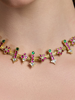 Unleash timeless elegance with this radiant gold-toned necklace and earring set, adorned with vibrant stones. Perfect for empowering your festive look with charm, grace, and royalty. Add matching earrings & accessories to complete the look.