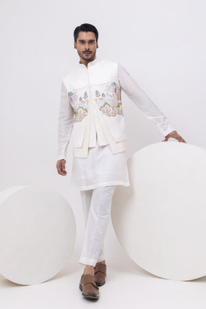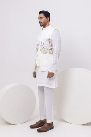 This ivory Designer Nehru jacket features intricate thread embroidery inspired by serene landscapes, trees, hills, and flights of birds, brought to life with handcrafted panel detailing.