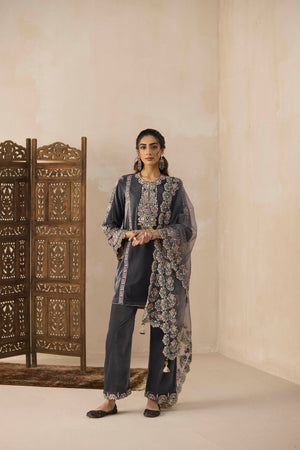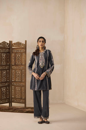 The short velvet kashmiri kurta with slight bell sleeves paired with straight pants. Features multicoloured thread and gold zari embroidery on the front, sleeves and pants, enhanced with metal sequence and ghungroos.