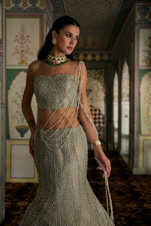 3D. Leaf Embroidery Fish Cut Lehenga With Corset