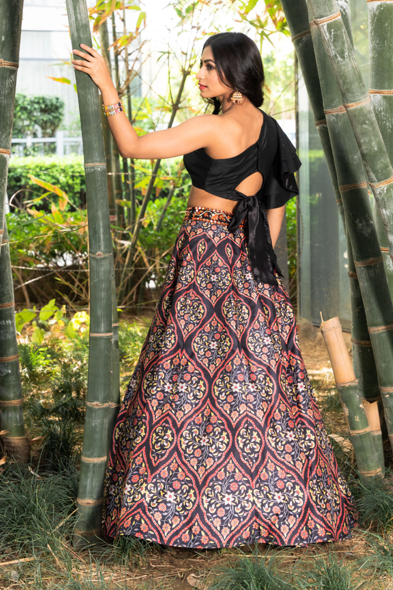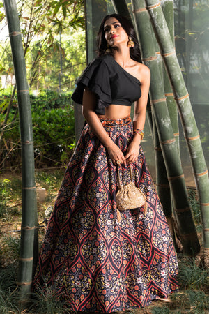 Black Dupion Multi Colored Printed Lehenga with Embroidered Belt paired with One Shoulder Cotton Silk Ruffle Blouse