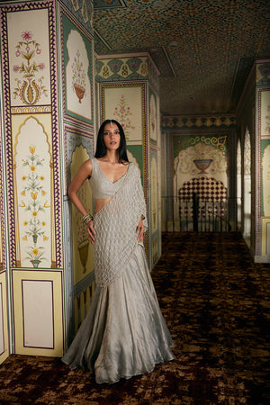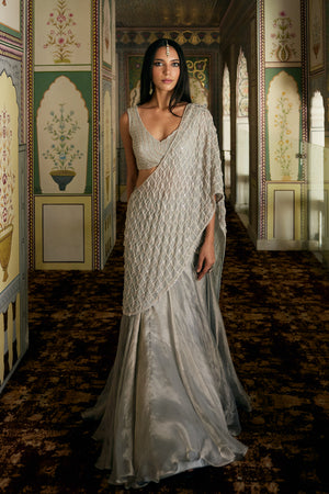 Tissue Drape Saree In Grid With Hanging Embroidery