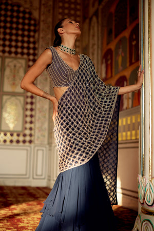Tiered Drape Saree In Grid And Hanging Embroidery With Embellished Blouse