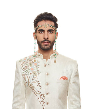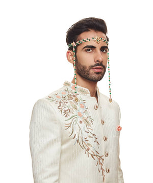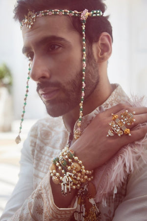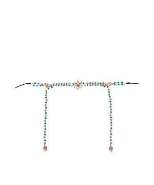 Amoli Mandavali Depicts Apsara’s Hands Showering Blessing In The Form Of Flowers And Palki Element At The Center. The Pieces Are Strung Together With Pearls, Melon Beads, And Meenakari Flowers.