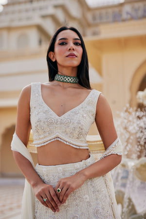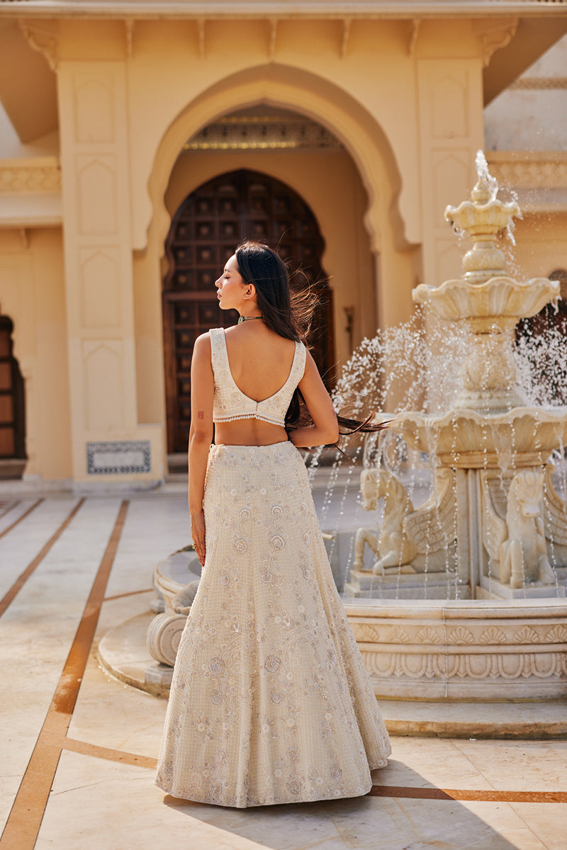 Flower And Grid Embroidered Lehenga With Embellished Blouse And Hanging Embroidery Dupatta