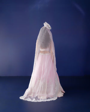Pink Resham and Pearl Hand Work Embroidered Lehenga Set with Scalloped Embroidery Pure Silk Organza Dupatta