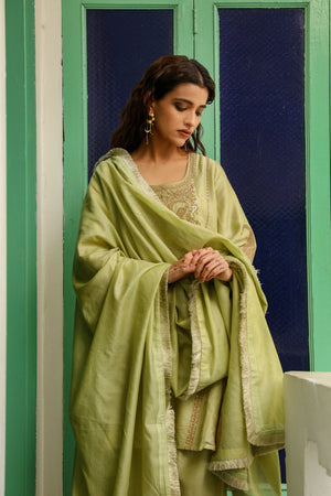 Pistachio green embroidered kurta with tonal salwar pants and silk chanderi dupatta