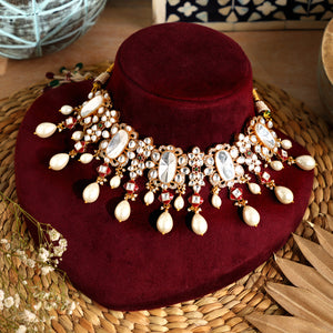 Celebrate timeless elegance with this designer Kundan necklace set featuring Meena work, exquisitely paired with semi-precious pearls and a matching tikka. Handcrafted with precision, this jewellery set blends traditional artistry with contemporary style, making it perfect for weddings, festive occasions, and special celebrations.