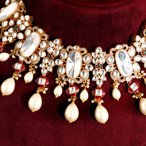 The intricate Meena detailing adds vibrant color and heritage charm, while the lustrous semi-precious pearls bring a touch of sophistication. Complete with a statement tikka, this Kundan Meena necklace set enhances lehengas, sarees, and designer ethnic outfits for a regal look.