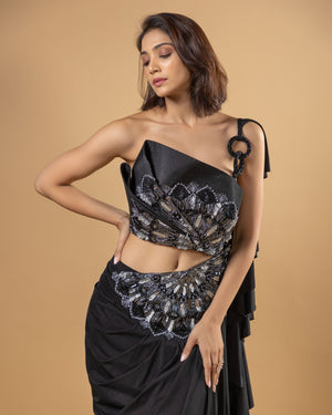 Featuring Kiara Black Drape Saree combined with sequins and cutdana Work. The blouse has handwork detail, palla is attached to the blouse