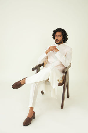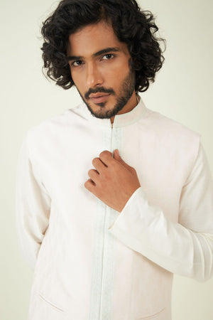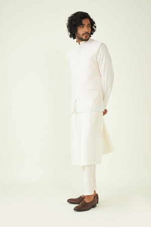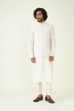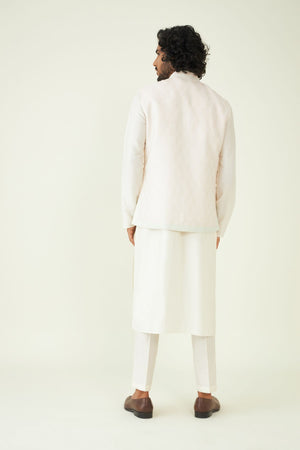 Our muted pink bundi set with off white kurta set is designed to make a lasting impression and inspire admiration wherever you go. Prepare to turn heads and evoke admiration with every step you take.