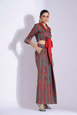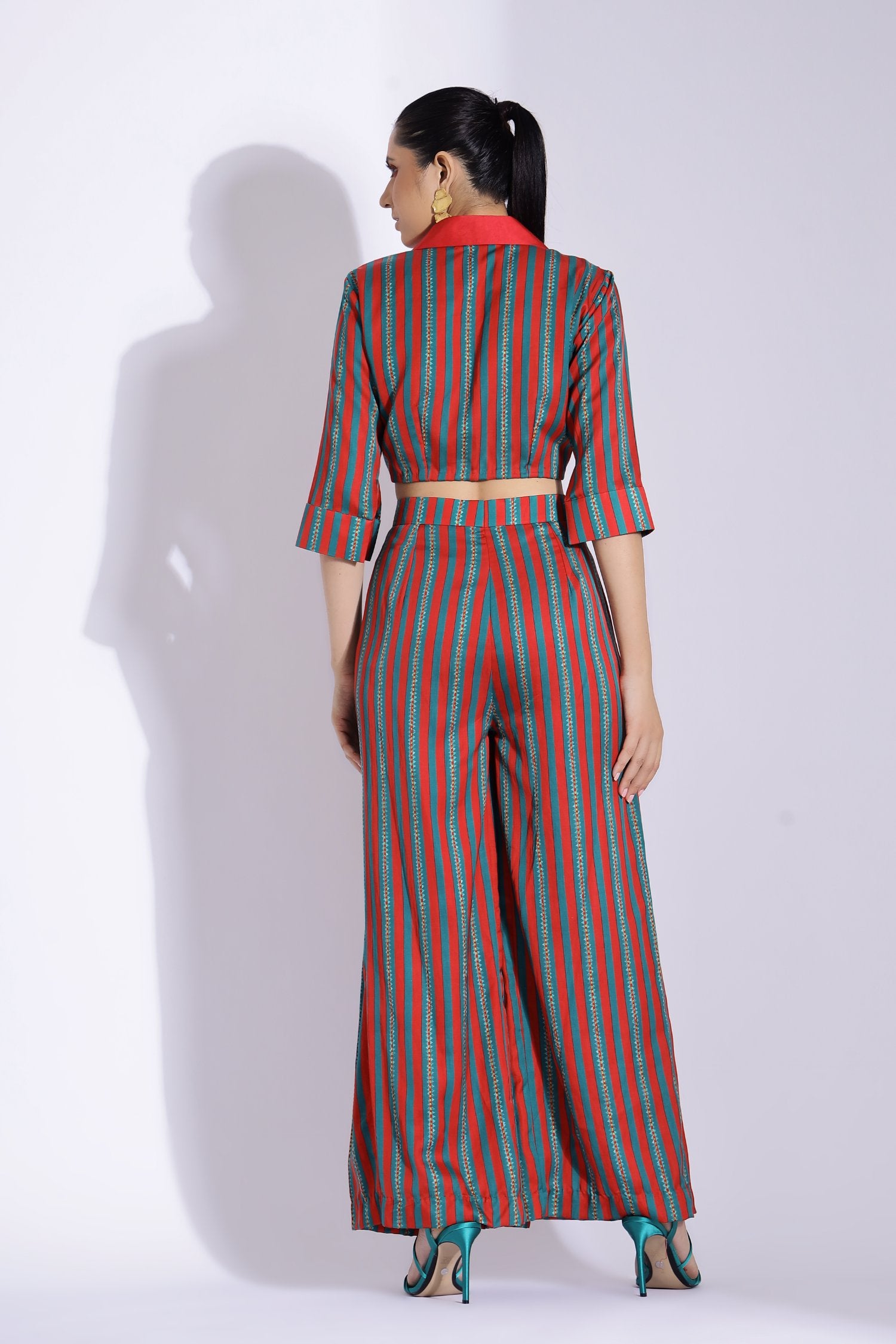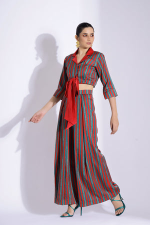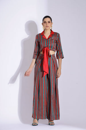 Featuring A Cotton Silk Digitally Printed Co-Ord Set Of A Knot Shirt With Solid Color Lapel And Knot Paired With An Inverted Pleated Pants