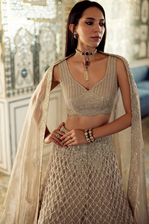 Jaal And Grid Embroidery With Hanging Embroidery Lehenga And Embellished Blouse Tissue Dupatta