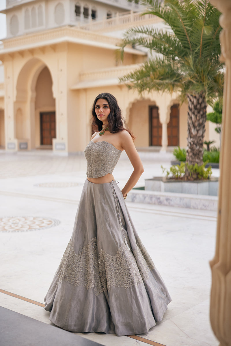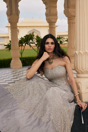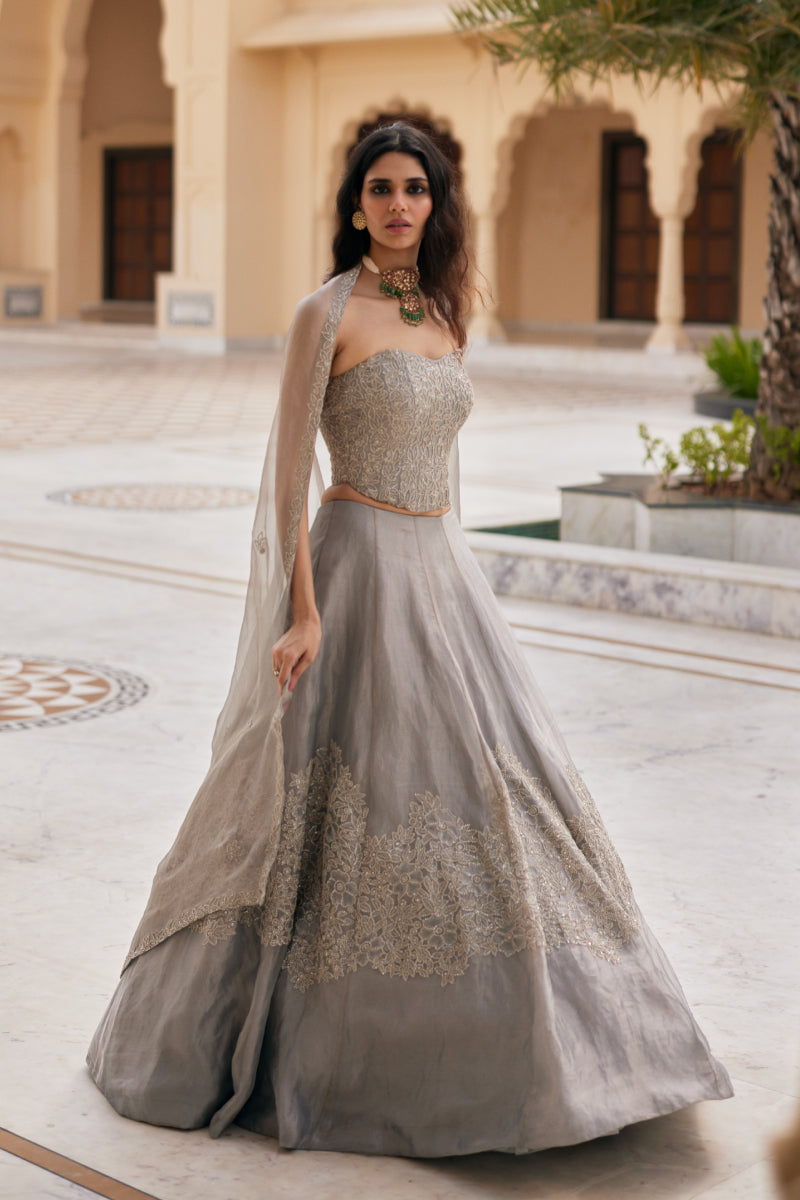 Placement Flower, Jal Embroidery Tissue, Lehenga And Embellished Tissue Corset With Embroidered Tissue, Dupatta