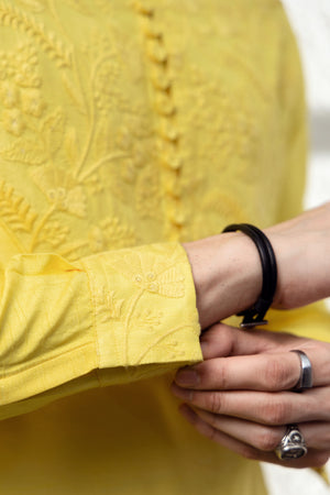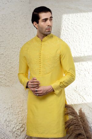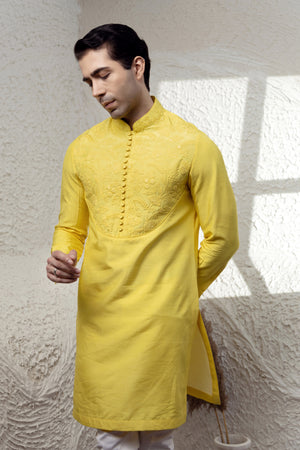 This Canary Yellow Kurta is a timeless piece, brought to life with intricate tone-on-tone chikankari embroidery on the chest yoke and sleeves. Crafted in a luxe silk blend, the kurta features a sharp mandarin collar, an arched embroidered yoke panel, and a delicate line of fabric buttons for a classic finish. Whether you’re attending a haldi, a daytime celebration, or a summer wedding, this piece stands out for its vibrant tone and handcrafted detail. Pair with ivory or white churidar or tapered trousers for a crisp ethnic look.